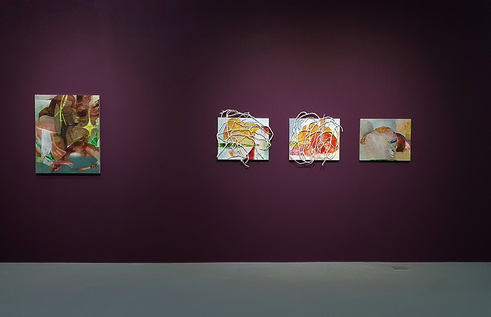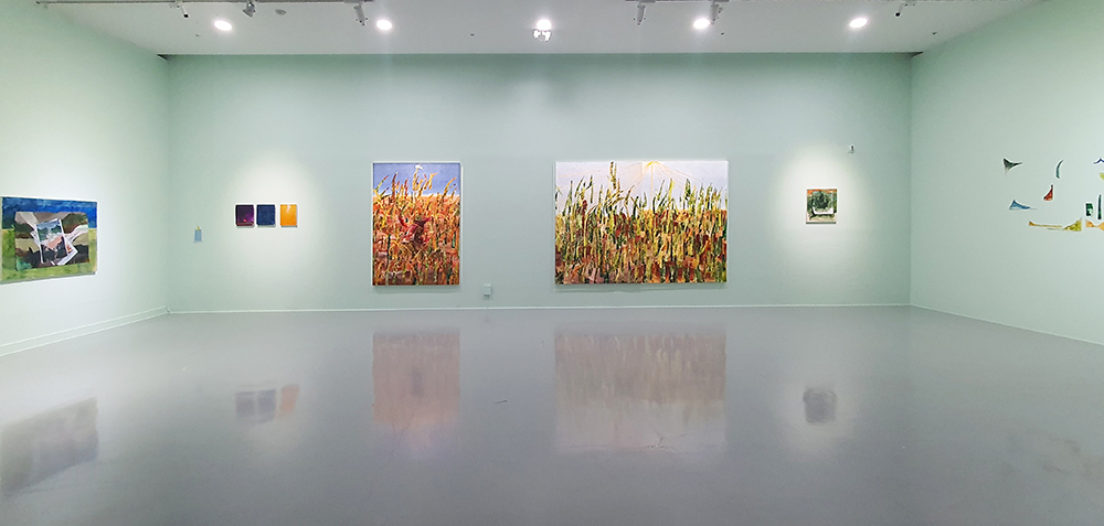 김선영은 작업하는 ‘나’와 나로부터 떨어져 나간 감각과 신체의 덩어리에 천착한다. 하나의 풍경으로 보이는 작품조차도 김선영의 풍경들로부터 획득한 레이어가 꼴라주 되어 하나의 풍경이 되는 과정을 거친다. 이 과정에는 여러 겹의 종이로 만들어진 장지의 속성이 활용된다. 안료를 머금은 종이의 층을 분리시켜 얻은 피막에 가까울 이미지가 화면에 덧대어져 포개어지는 것이다. 이와 같은 작업 방식은 〈piece, 또는 포개진〉과 〈둘, 하나가 되는 조각〉과 같은 작품의 제목에서 의미로 고양된다. 조각이지만 한편 포개어져 단편에 그치지 않고, 둘이지만 또한 하나가 되는 조각 그 자체가 회화이기도 한, 회화의 목표가 방식과 합류하는 지점이 발생한다. 그러나 여기서 합류는 합일을 지향하지 않는다. 단적으로 〈마치, 세계〉는 떨어져 나온 회화 조각들에 석고를 덧댄 덩어리들이 자유롭게 연합하여 만들어지는 또 다른 세계를 표상한다. 이처럼 김선영의 세계 감각은 풍경 아닌 ‘풍경들’이 되어 복합적인 이미지로 제시되고 있다.