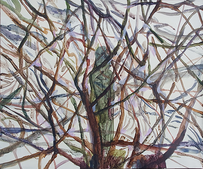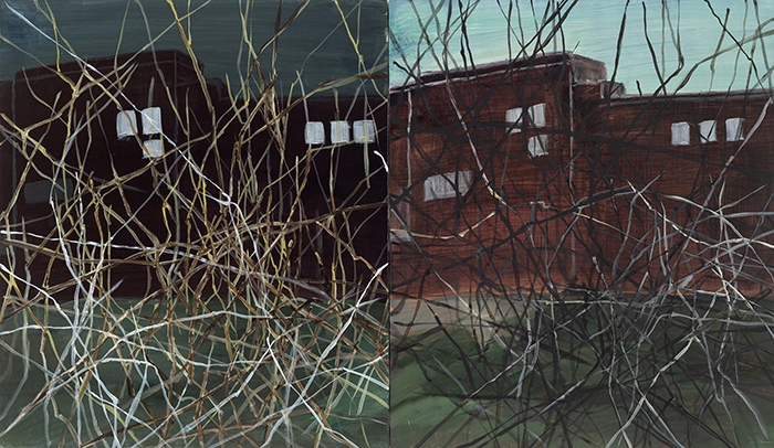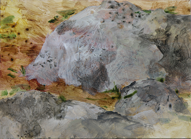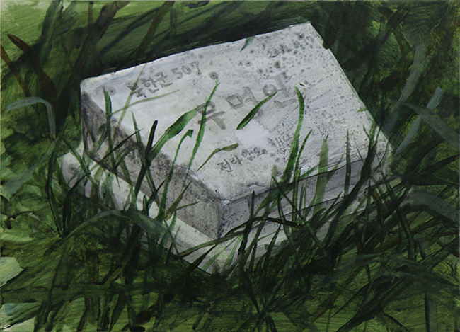 경기도 파주에 위치한 작업실을 사용할 때 밤에 웅웅거리는 소리때문에 잠을 자지 못했다. 언젠가 그 소리의 근원을 찾아 봤는데 그 소리는 ‘대남방송’이었다. 반공교육을 받지 않은 나에게 개념으로만 존재하던 ‘북한’은 그렇게 나의 살갗에 내려앉았고 내려 앉은 존재에 다가가려하자 바로 가로막혔다. 우리는 이념의 경계와 지리적 경계 사이에 위치하고 있었고 그 후 부터 매일 그 ‘사이경계’를 찾아 북한을 보러 다녔다. 북한을 보러가는 길은 삶에 스민 경계처럼 아무렇지 않는 풍경이었다. 나는 전혀 다르지않는, 평범하지만 비범한 속내를 가진 풍경을 그리며 삶에 스치듯 스민 어떤 경계를 표현하고 싶었다. 위의 작품은 그 그림 180여개 중 일부이다.